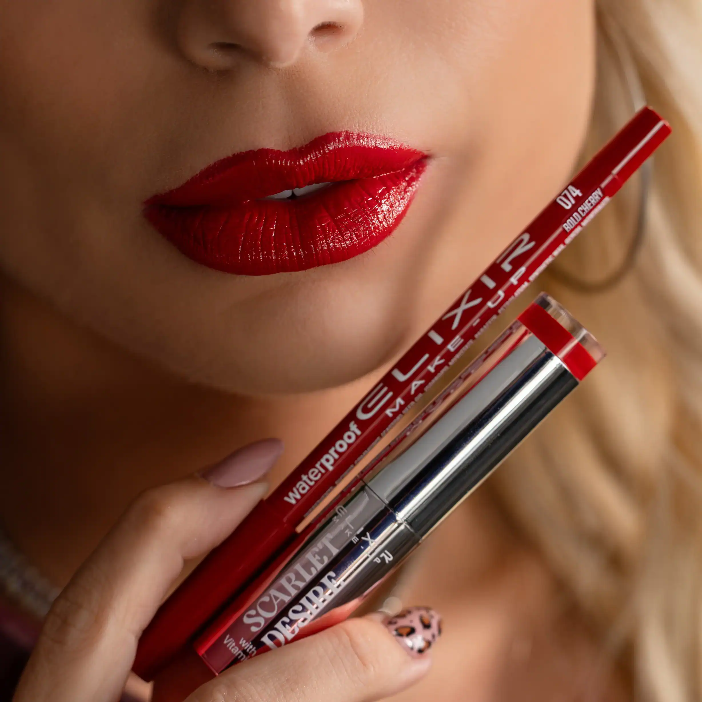 Το νέο satin κραγιόν Scarlet Desire χαρίζει shiny, ενυδατικό αποτέλεσμα, ενώ το NEO Waterproof Lip Liner προσφέρει σταθερό περίγραμμα που δεν μετακινείται.